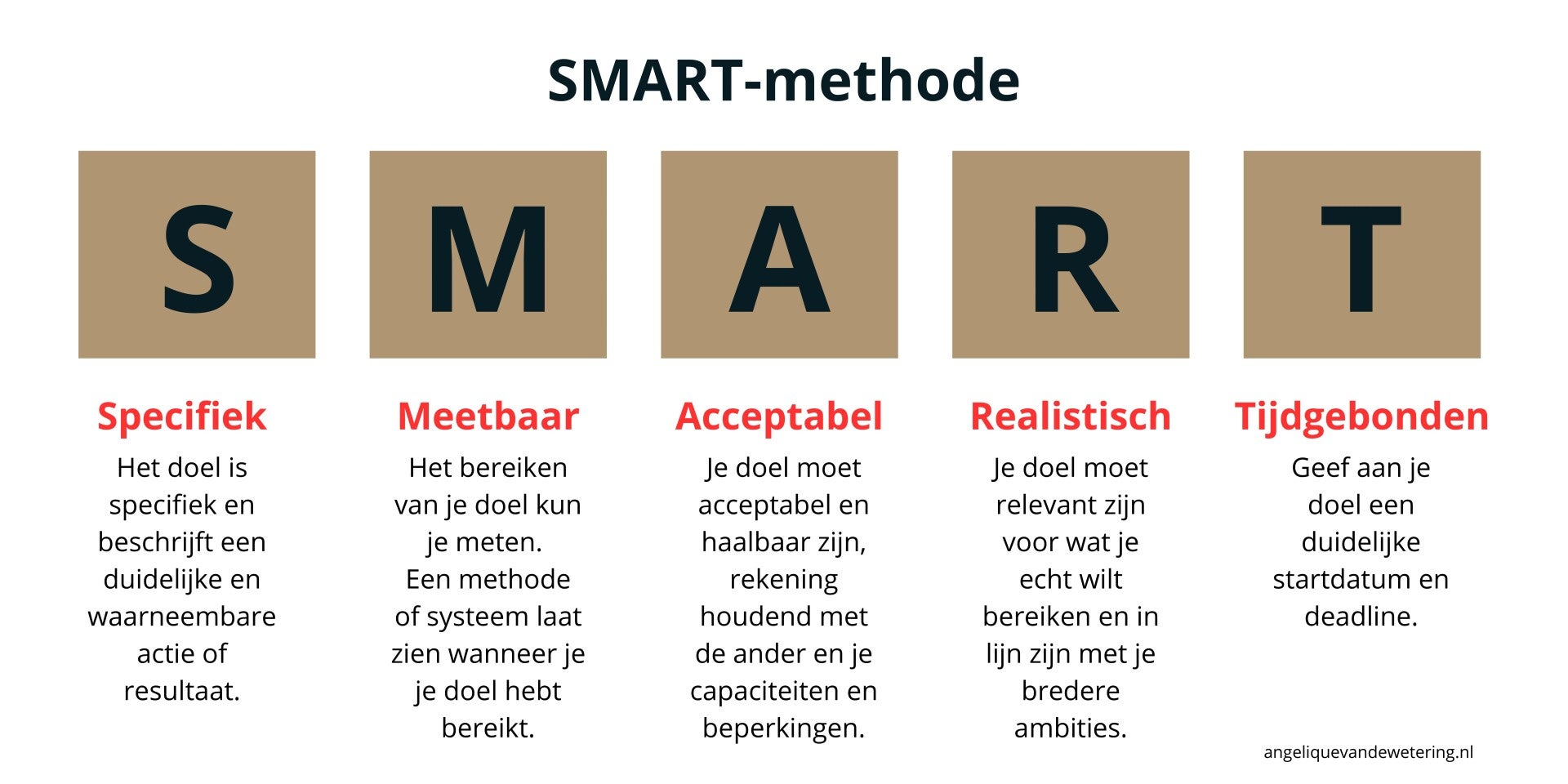 Elk van deze stappen moet Specifiek, Meetbaar, Haalbaar, Realistisch en Tijdgebonden zijn, wat bekend staat als de SMART-methode.